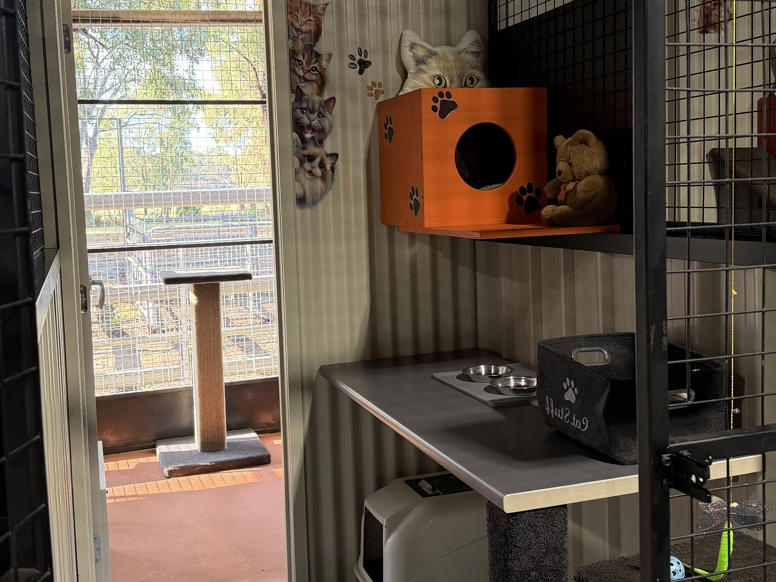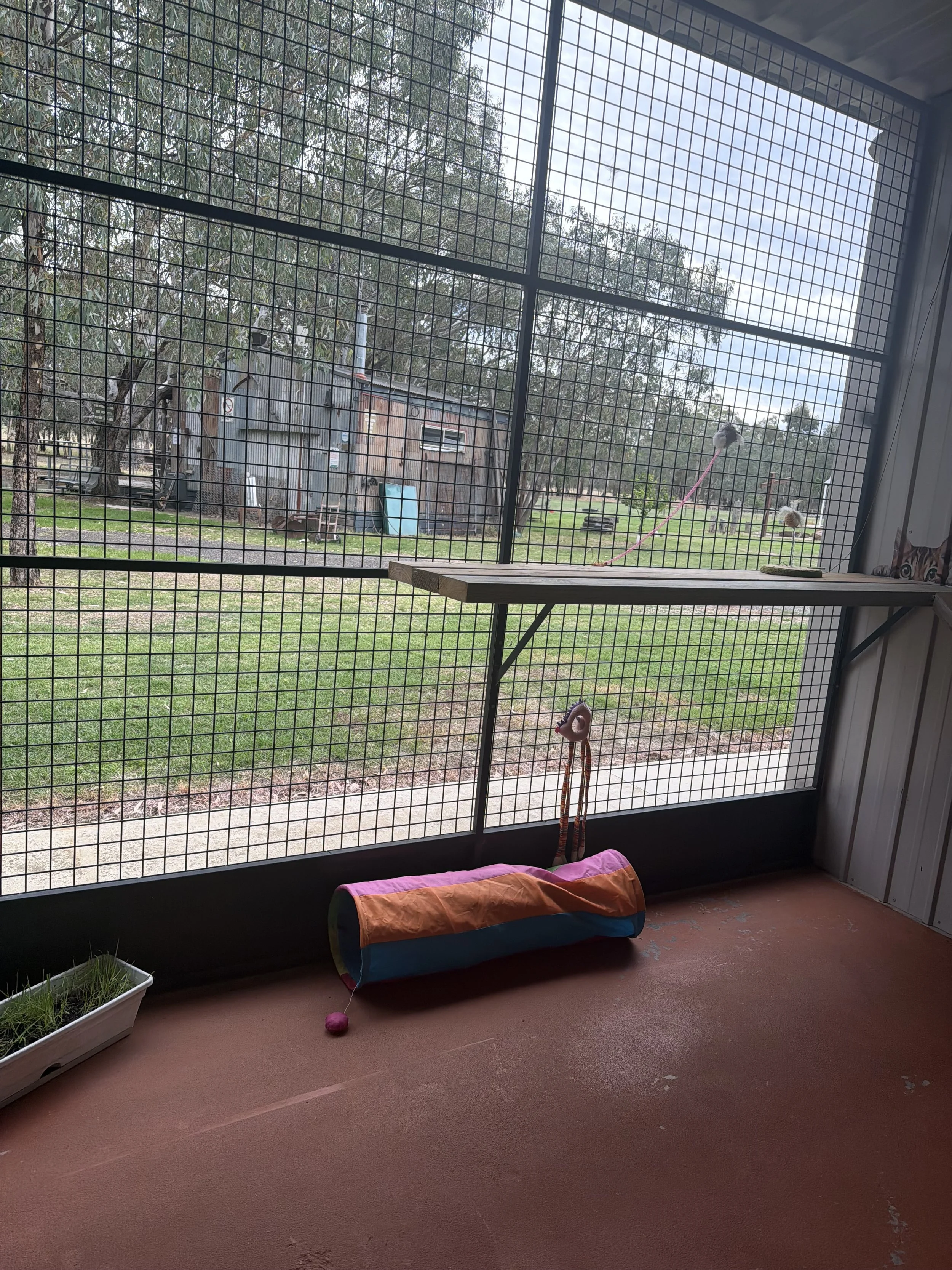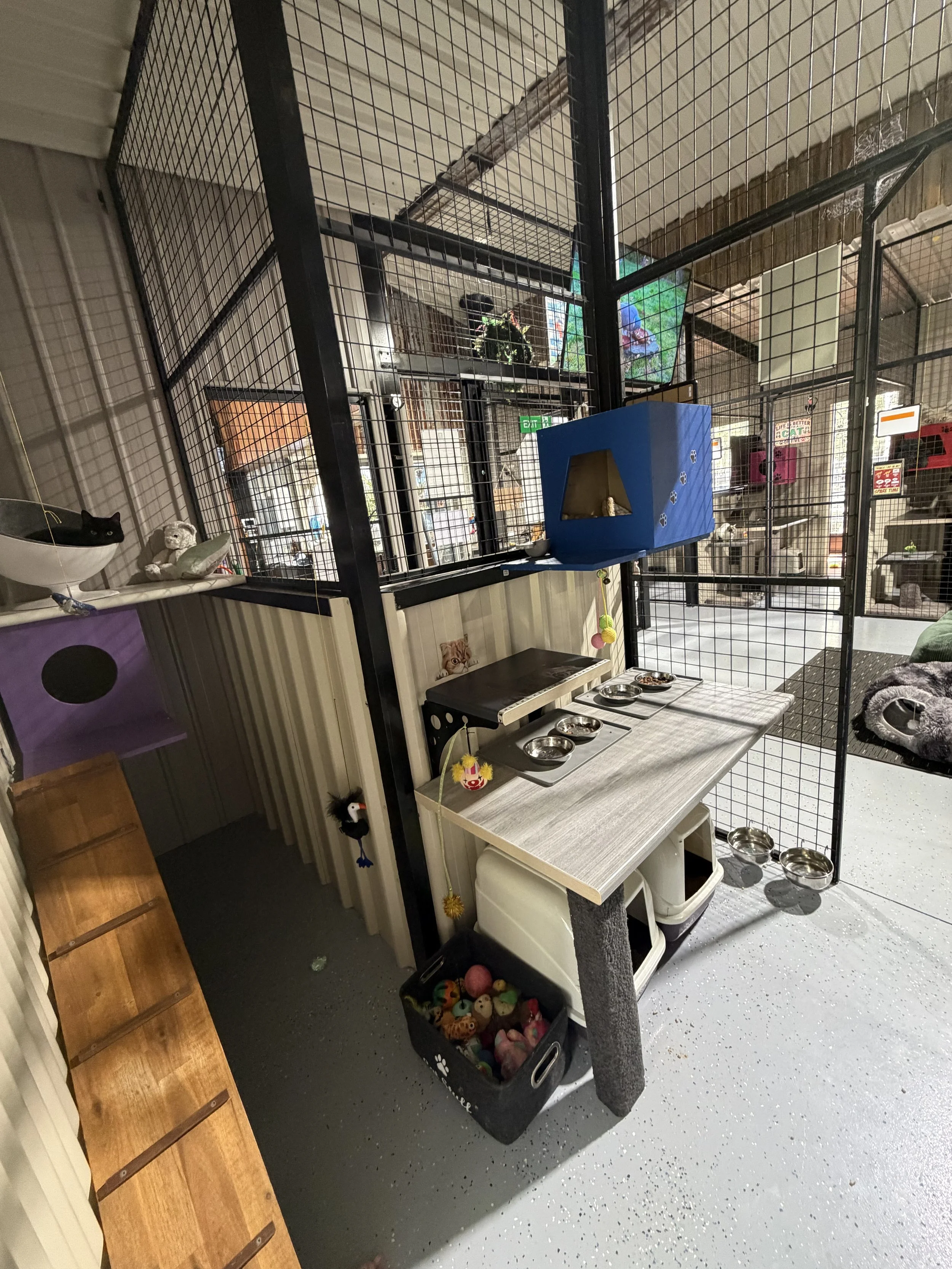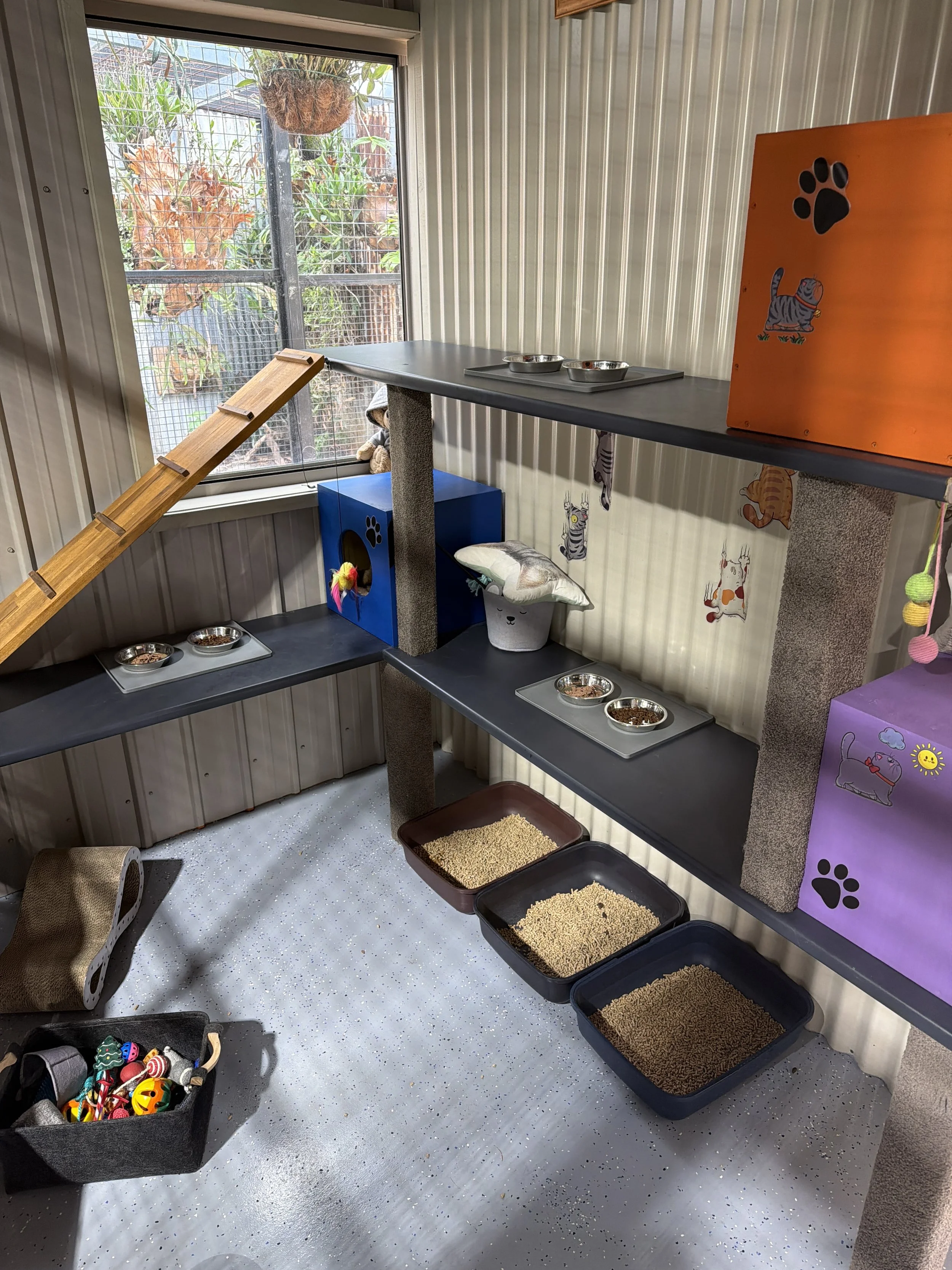 The guests can venture to their outside space through a full-size door or a safe sliding cat door and snooze the day away or have a play on their climbing platform or simply watch the birds or the sheep in the paddocks outside.